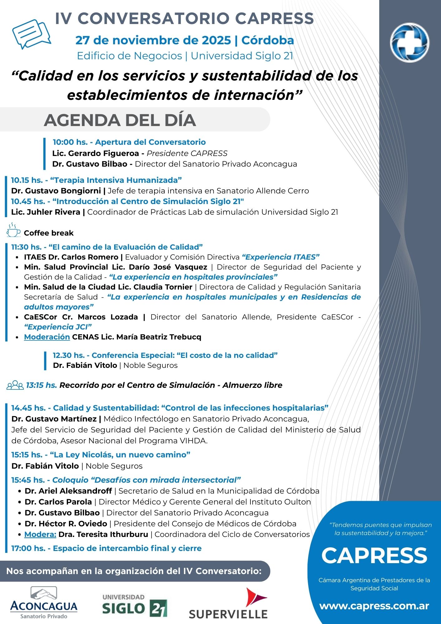 ¡Agenda confirmada! – IV Conversatorio 2025 en Córdoba https://capress.com.ar/agenda-confirmada-iv-conversatorio-2025-en-cordoba/ Sat, 22 Nov 2025 01:17:09 +0000 https://capress.com.ar/?p=1075 Inscripciones aquí El próximo jueves 27 de noviembre, CAPRESS llevará adelante el IV Conversatorio 2025, un espacio de actualización y diálogo estratégico para el sector salud. El último encuentro del año se realizará en el Edificio de Negocios de la Universidad Siglo 21 (Córdoba), bajo el eje central: “Calidad en los servicios y sustentabilidad de […]